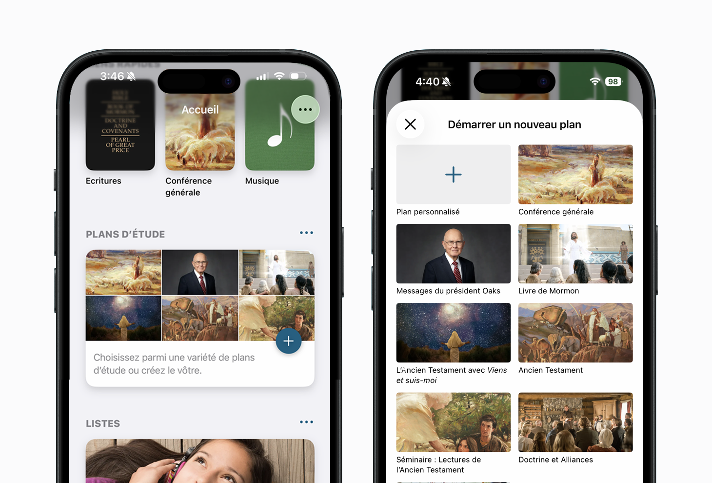 - Plans d’étude : Les plans d’étude de la « Médiathèque de l’Évangile » permettent aux utilisateurs d’établir un calendrier pour étudier n’importe quel contenu de l’application. En plus de créer des plans personnalisés, les membres peuvent utiliser trois plans fournis par l’Église pour faciliter leur étude de l’Ancien Testament :